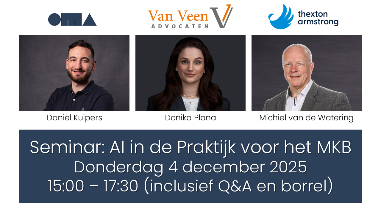 Op 4 december 15.00 – 17.30 organiseren Daniël Kuipers (OMA), Donika Plana (Van Veen) en Michiel van de Watering (thexton armstrong) hét AI Seminar voor MKB ondernemers in de regio.